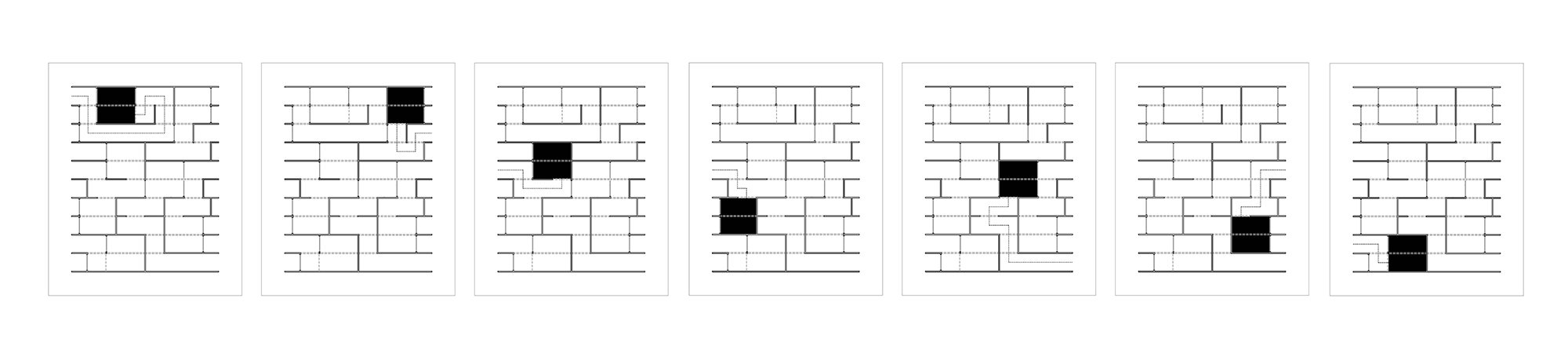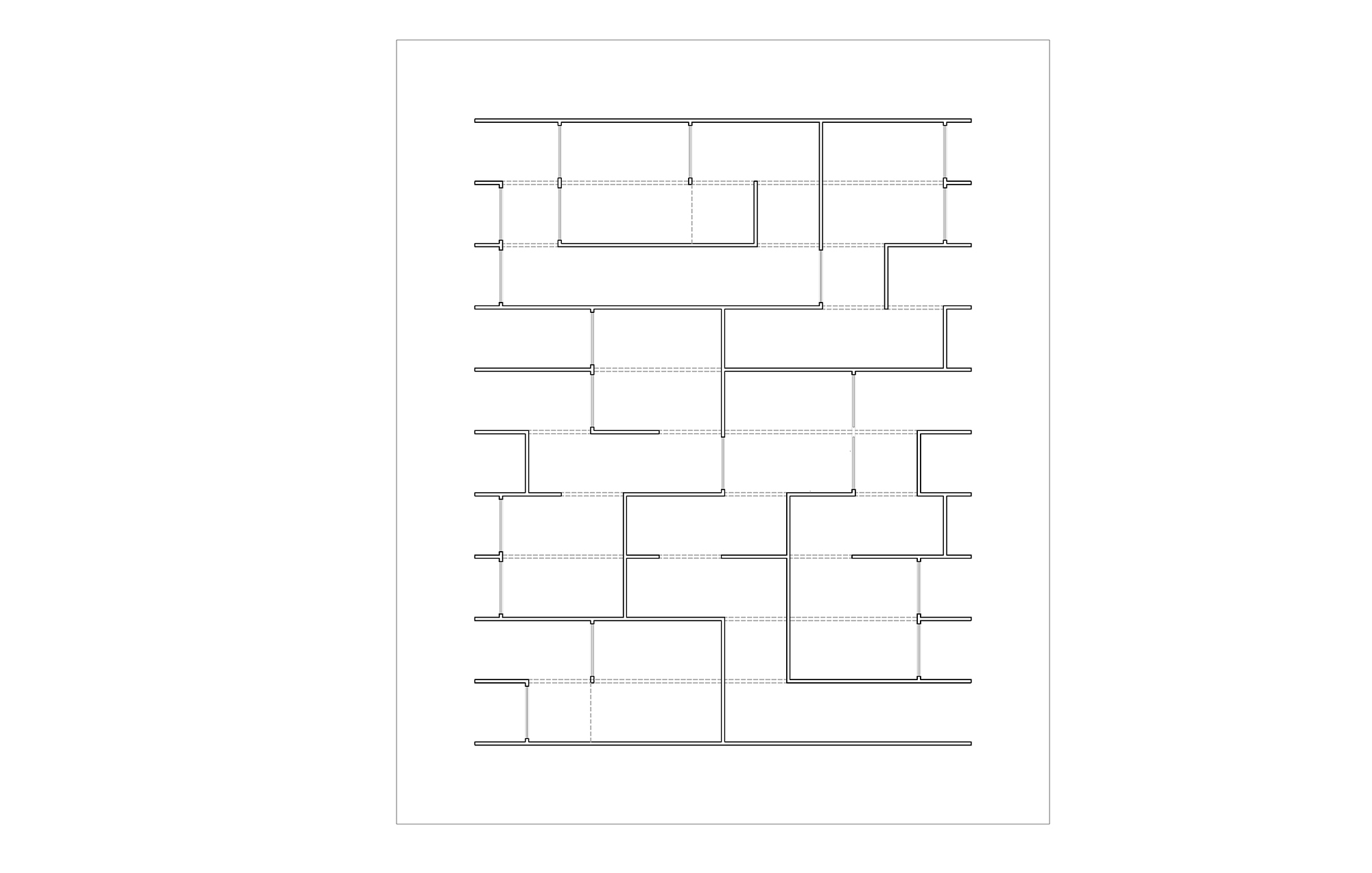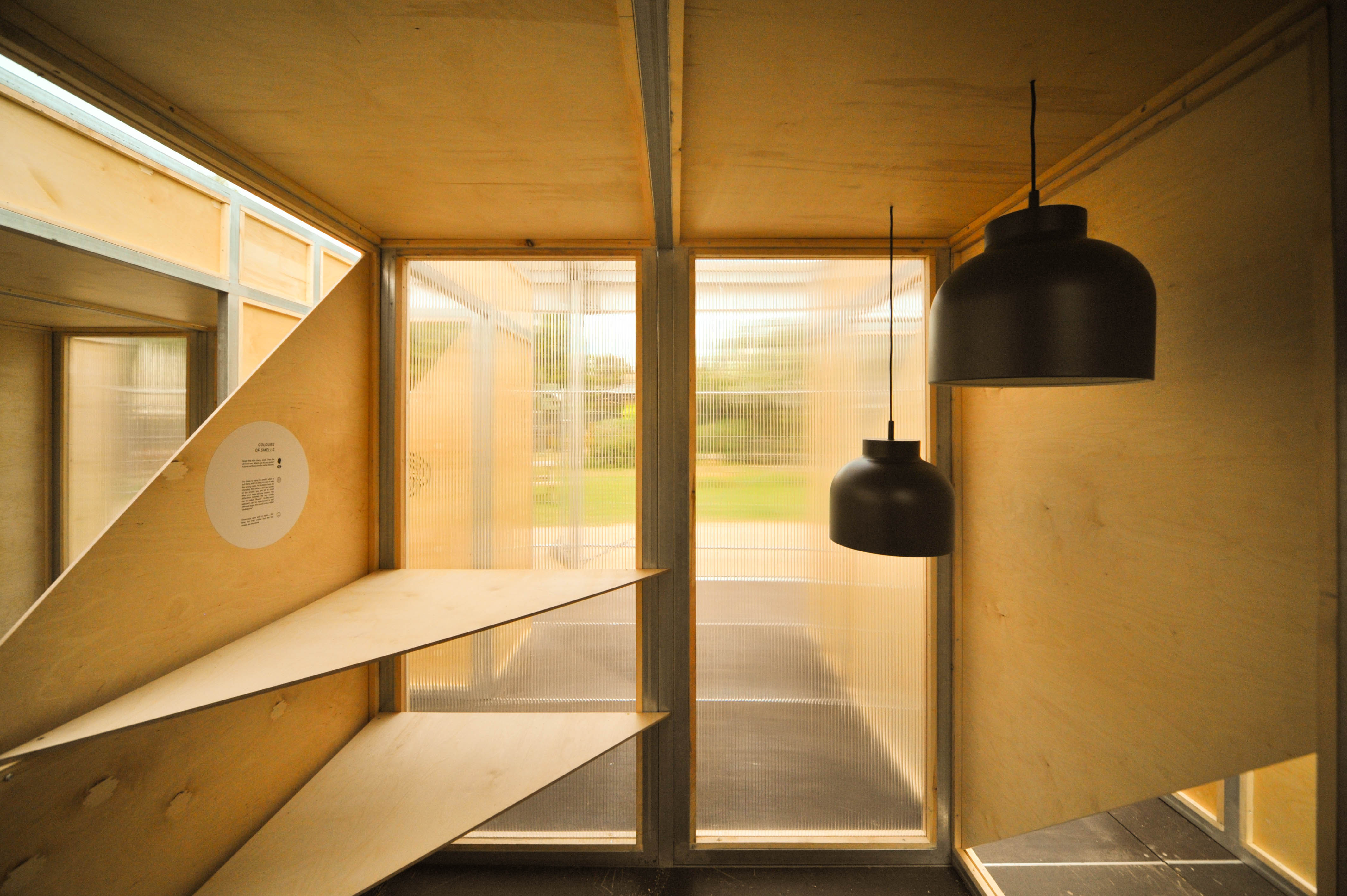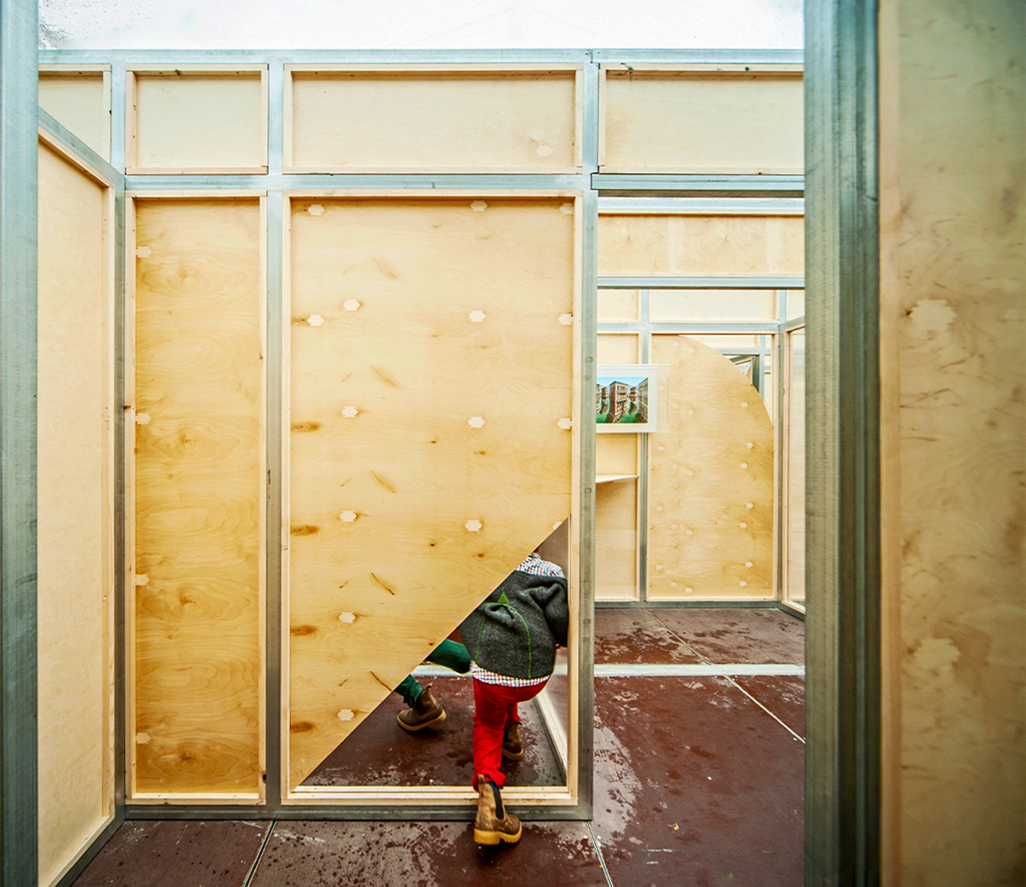 "Los paneles tienen cortes circulares o rectos que generan vistas transversales y relacionan espacialmente unos laberintos con otros, reordenando el mapa mental del visitante. Estos cortes hacen que los alzados tomen un cierto carácter caligráfico, articulando un lenguaje formal fluido. Los paneles pueden intercambiarse y reorientarse en las sucesivas instalaciones del laberinto, y así dar lugar a nuevas formas que generan otras conexiones visuales y físicas."