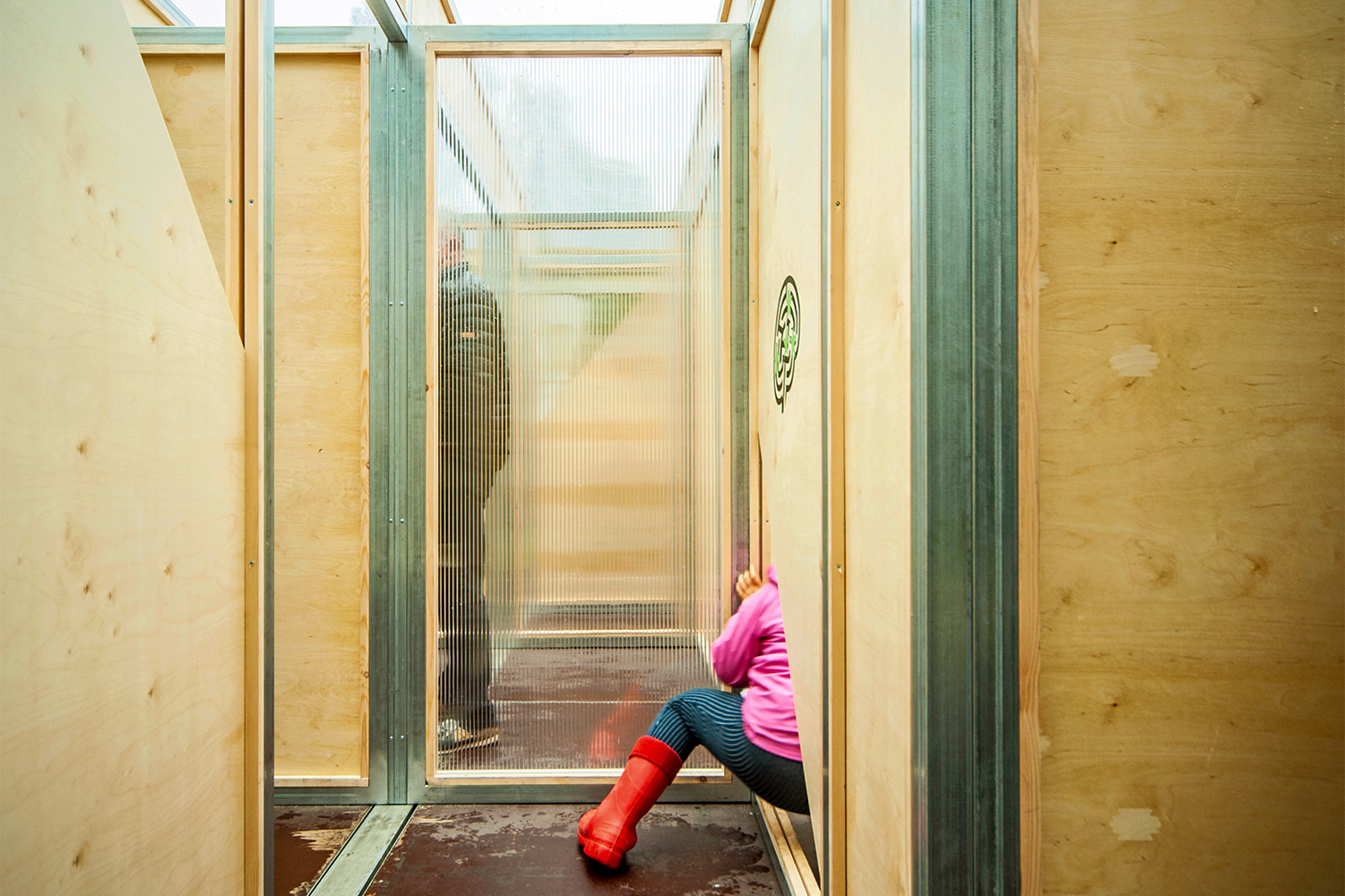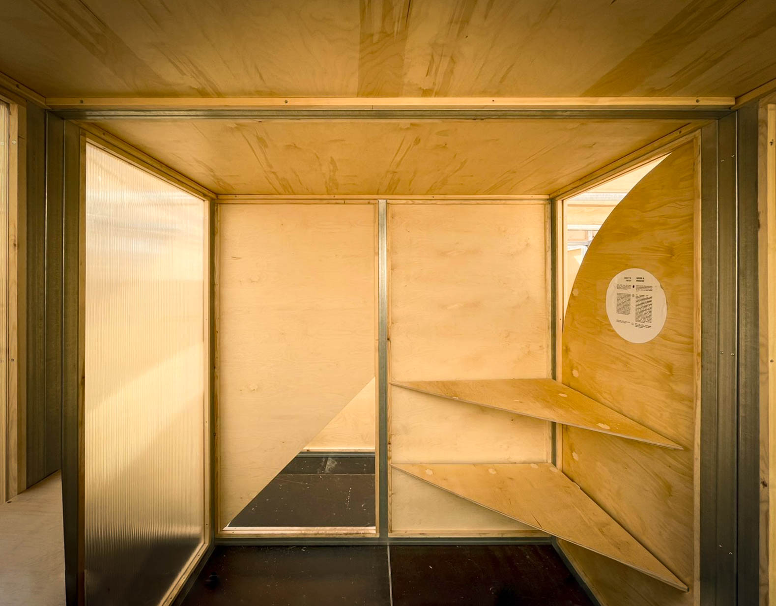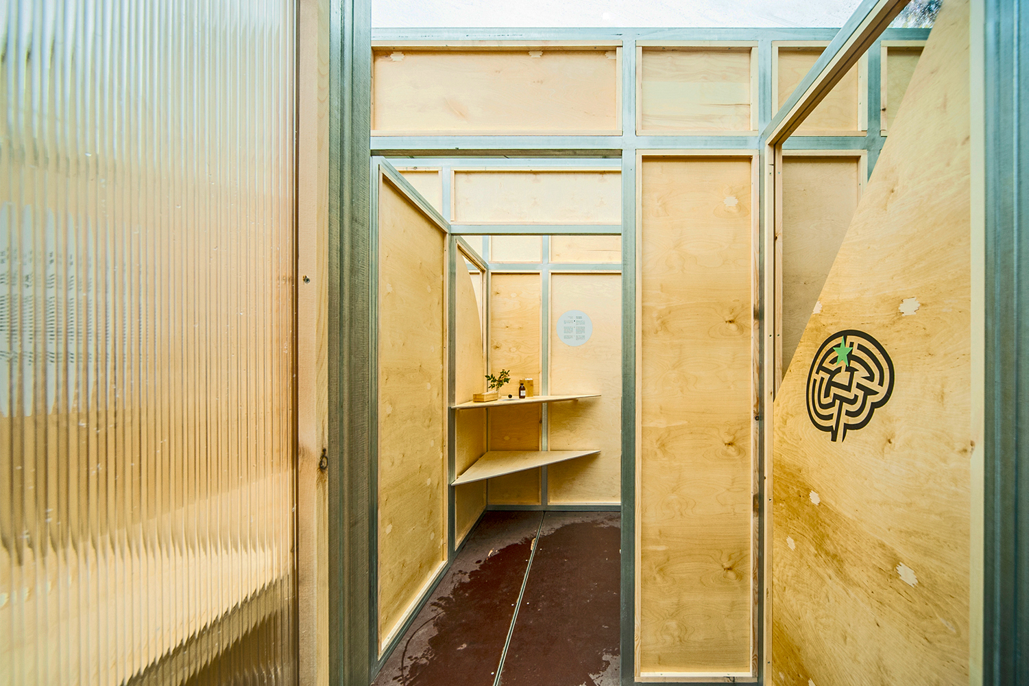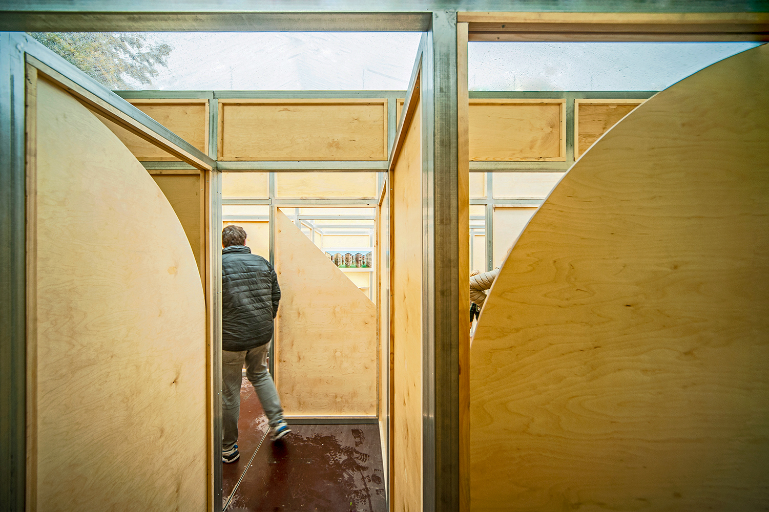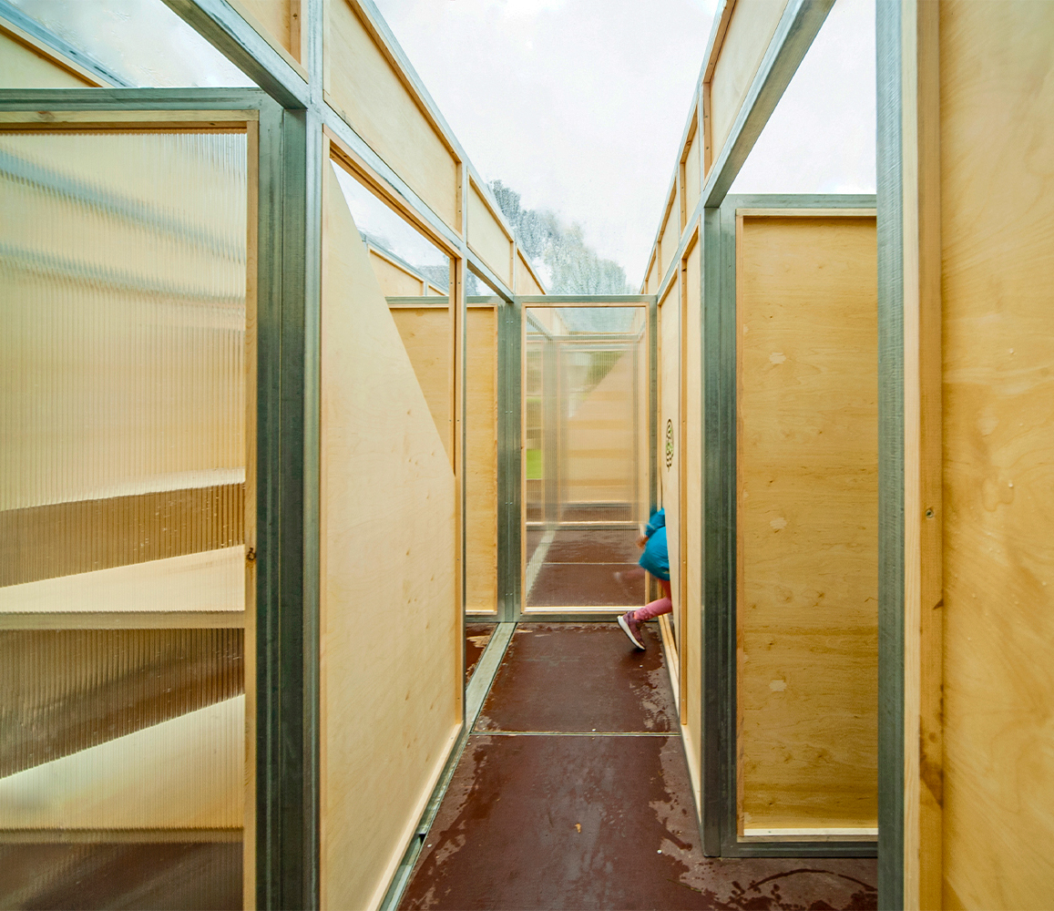 "La materialidad del laberinto tiene también una condición híbrida, que se radicaliza en la construcción con materiales del ciclo natural (la madera), y otros industriales (el acero). Los muros están compuestos por una estructura modulada de tubos de acero galvanizado, sobre la que se instalan paneles de madera laminada de abedul, ajunquillados con madera de pino. Para las paredes translúcidas se utilizan paneles de policarbonato celular."