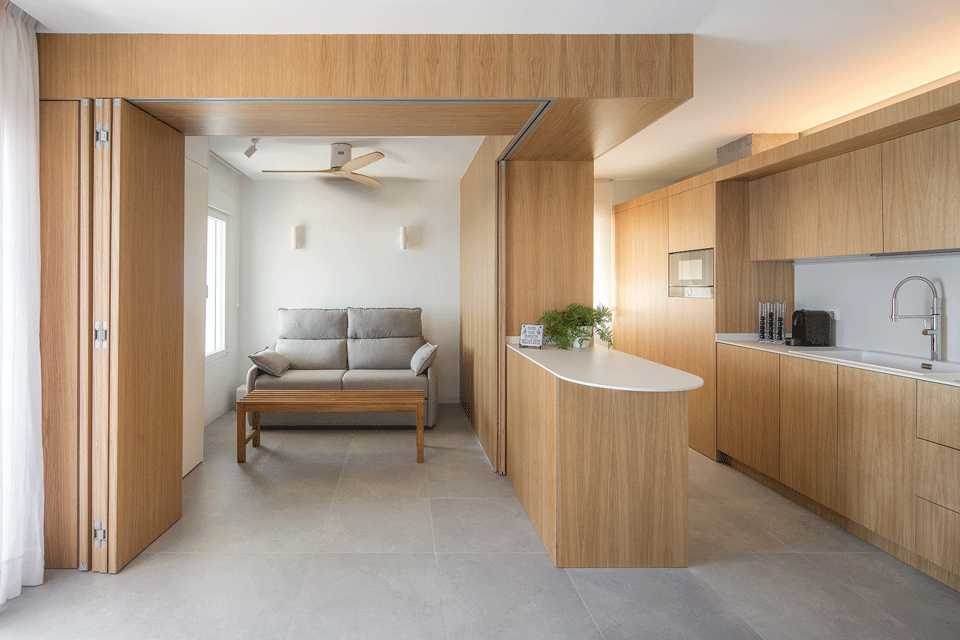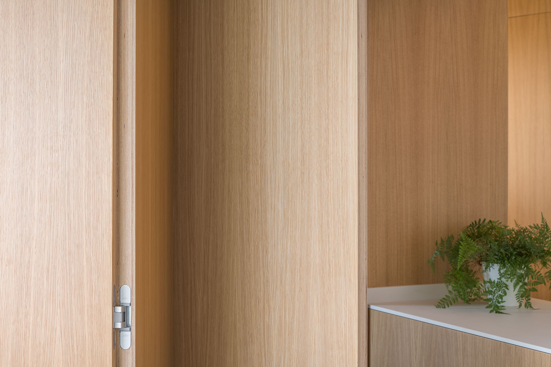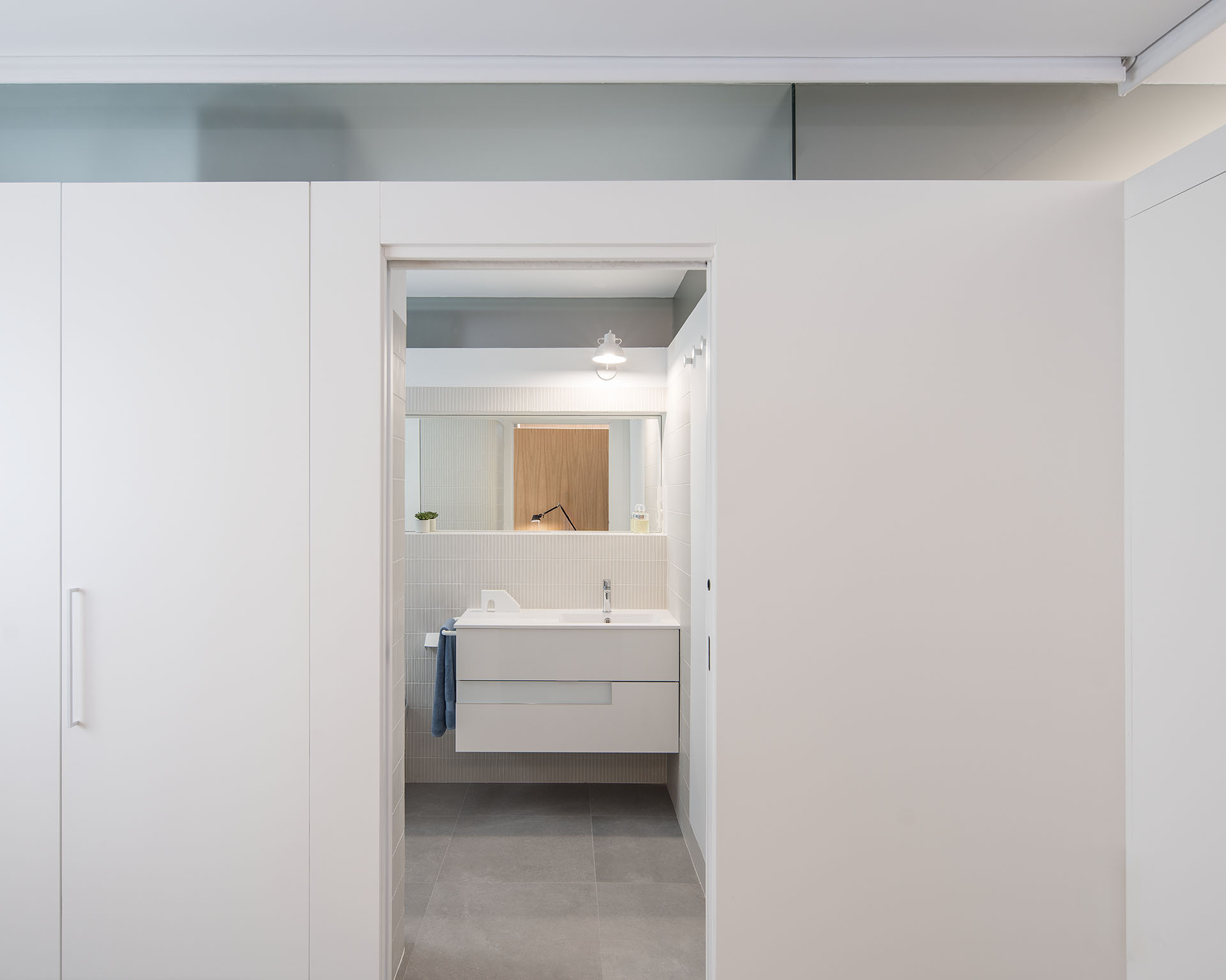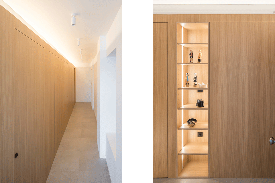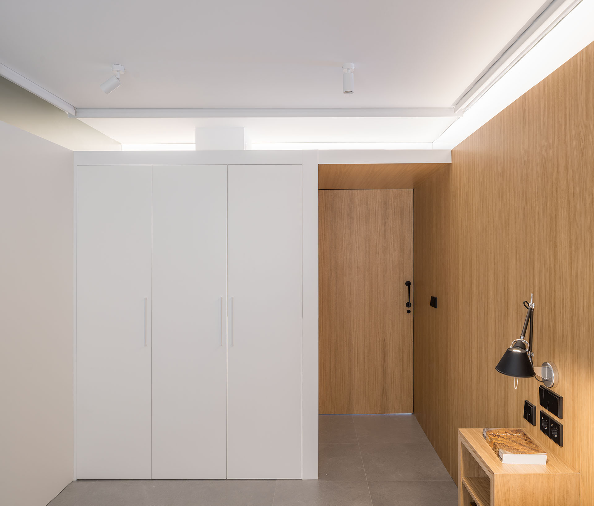 Las puertas ocultas potencian esta imagen, desdibujando el límite de la vivienda cuando la caja está cerrada. La altura del mueble, marcada a 2,20m, permite disponer de un cerramiento continuo de vidrio entre mueble y techo que aporta luz desde las aperturas perimetrales del apartamento al pasillo de entrada. Para asegurar el oscurecimiento en las diferentes estancias, se oculta en falso techo un sistema de estores mecanizados paralelos a los vidrios.