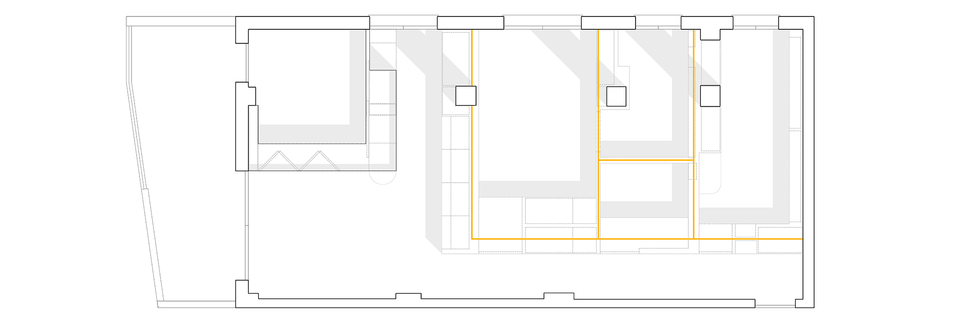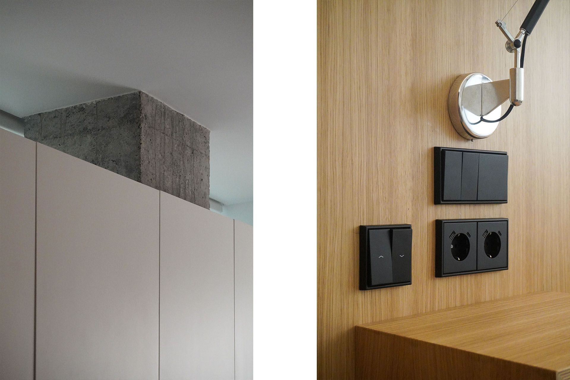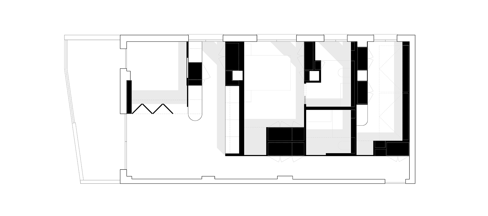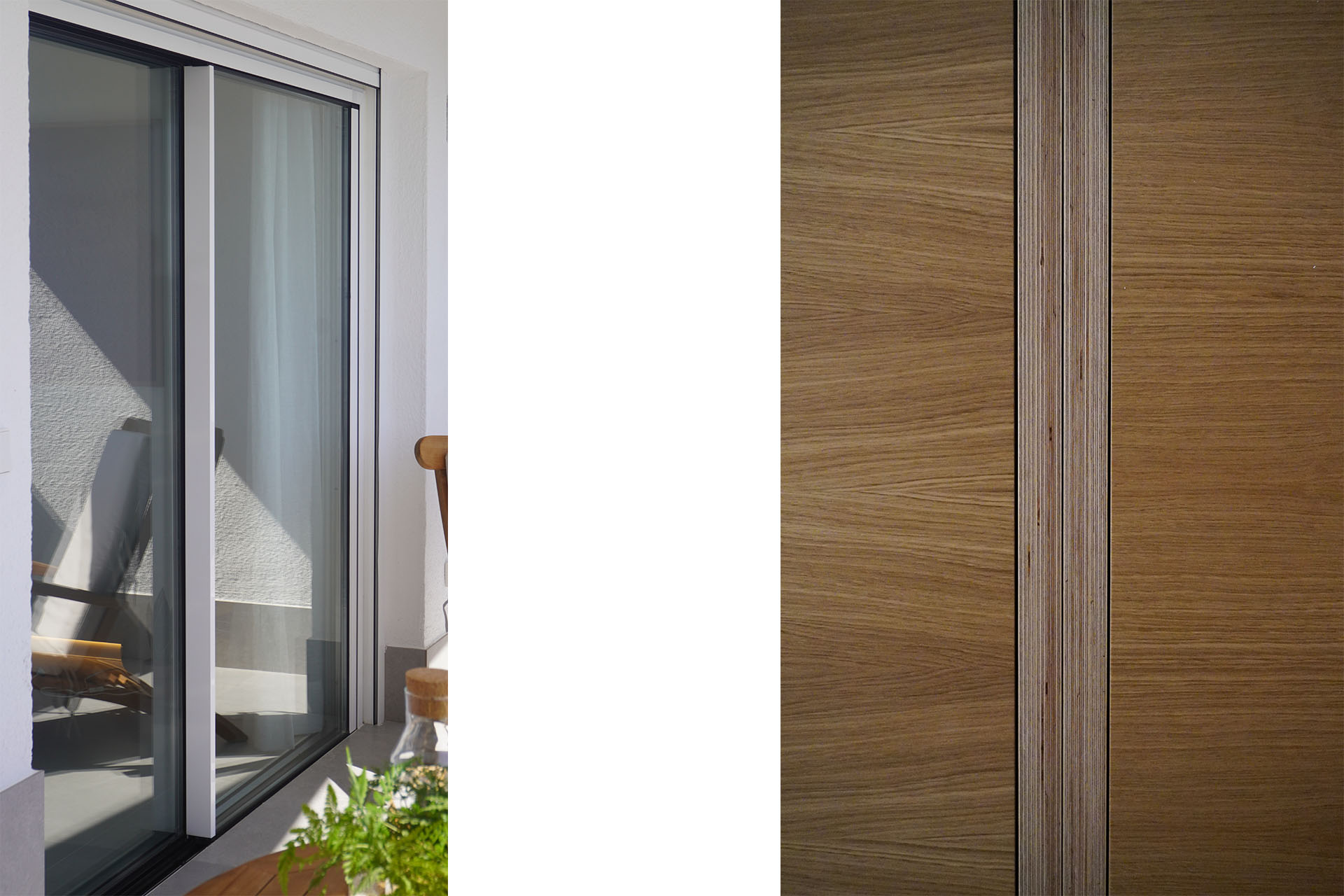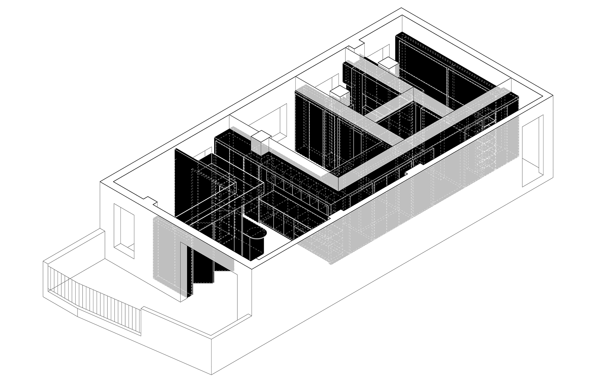 Las puertas ocultas potencian esta imagen, desdibujando el límite de la vivienda cuando la caja está cerrada. La altura del mueble, marcada a 2,20m, permite disponer de un cerramiento continuo de vidrio entre mueble y techo que aporta luz desde las aperturas perimetrales del apartamento al pasillo de entrada. Para asegurar el oscurecimiento en las diferentes estancias, se oculta en falso techo un sistema de estores mecanizados paralelos a los vidrios.