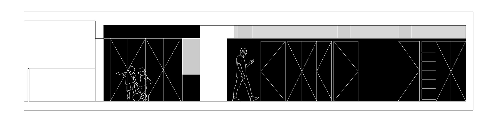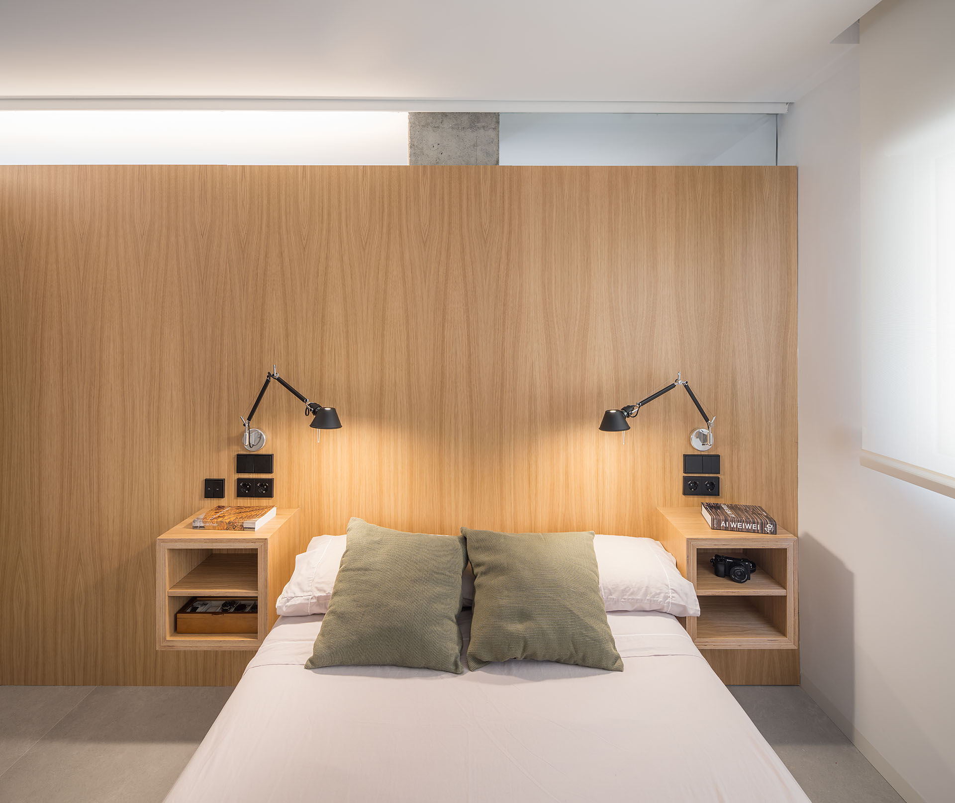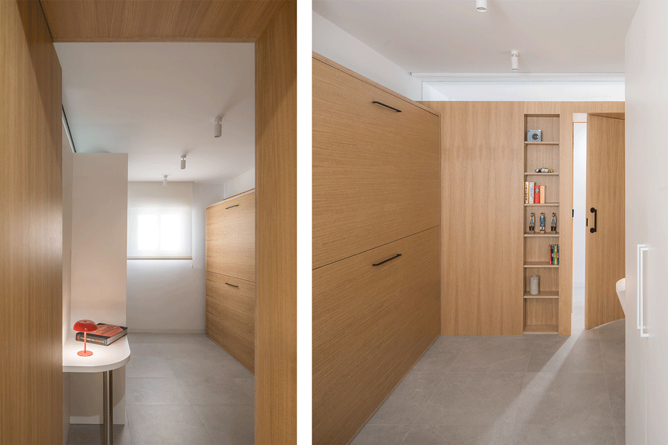 En una casa llena de puertas ocultas y de reducido espacio, la presencia de camas fijas imposibilita el uso diario de sus dos habitantes, por lo que se opta por plantear un sistema de camas plegables, en el caso del cuarto de los niños, y de puertas de librillo/abatibles, en el caso del cuarto de invitados. La primera estrategia libera el espacio para que los más pequeños puedan jugar en toda la habitación o utilizar el escritorio para estudiar en las largas tardes de verano, quedando las literas integradas en un paramento de 2m por 4m.