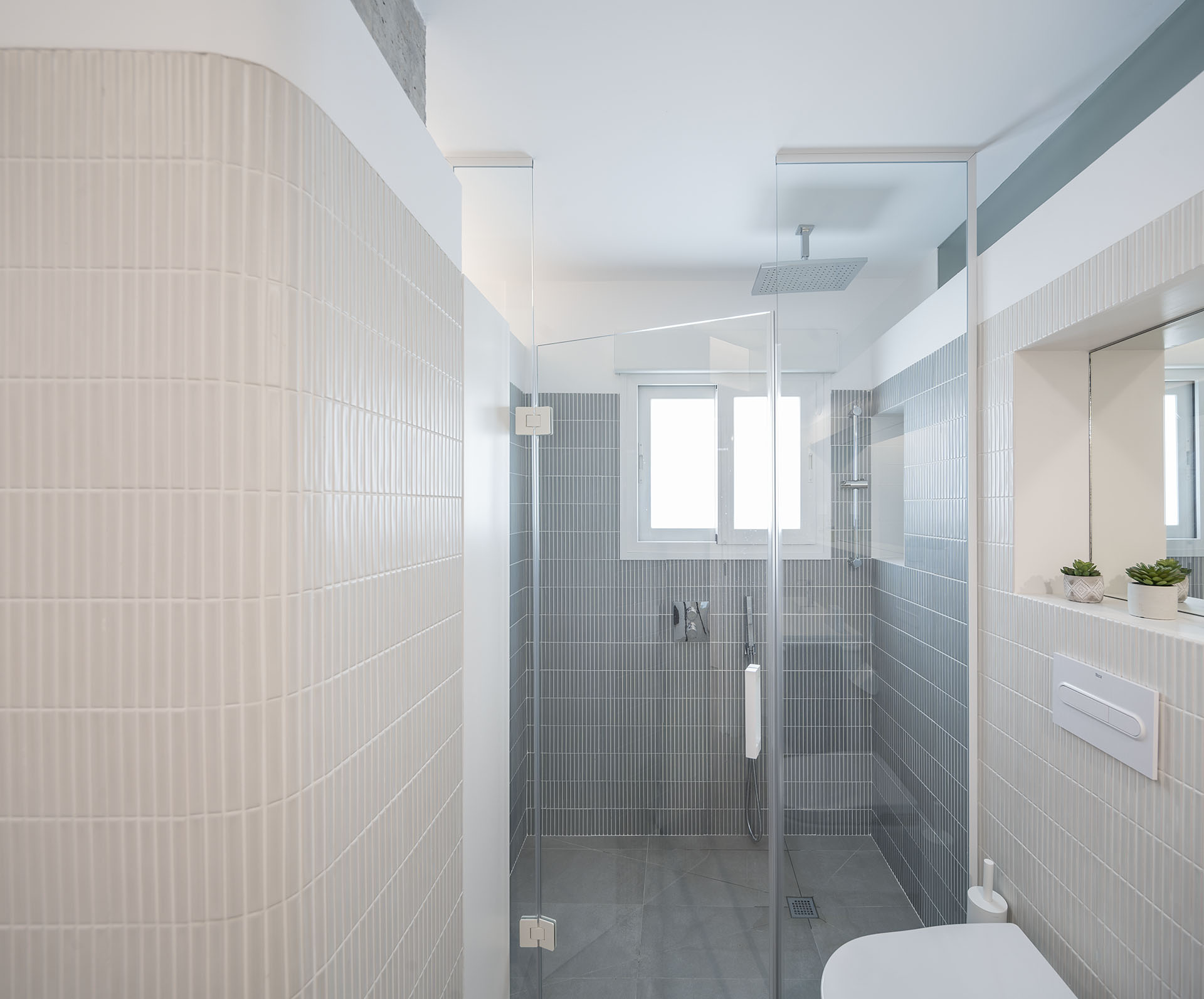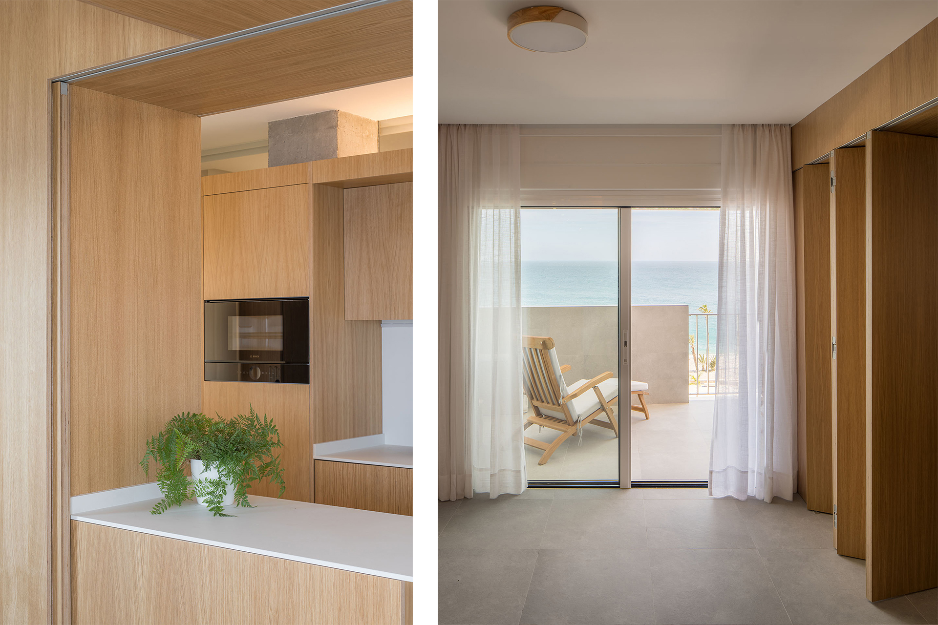 Partiendo de una premisa arquitectónica sin valor espacial ni constructivo, se decide dar la vuelta a la planta actual para plantear una vivienda volcada hacia el mar, donde salón y cocina se abren a la terraza de amplias dimensiones. La orientación sur hacia la costa de Velilla, Granada, asegura un aporte solar continuo a lo largo del día. Adaptándose a la estructura portante del edificio, el proyecto plantea una sucesión de habitación/baños/habitación/zona común que permite reducir al mínimo el impacto de los pilares presentes en la planta. De esta forma, el mobiliario planteado se amolda a las dimensiones de estos, rodeándolos, y conformando, junto con la franja en el pasillo, una caja habitable.